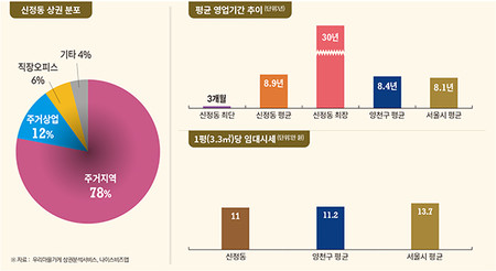 신정동은 주거지역 78%, 주거상업 12%, 직장오피스 6%, 기타 4%로 구성된 주거지역 위주의 상권이다.