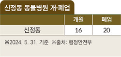 행정안전부 최신 데이터에 따르면, 양천구 신정동은 1994년부터 동물병원이 개원하기 시작해 2024년 1월 31일 기준 총 36개소가 개원, 이 중 20개소(56%)가 문을 닫고, 현재 16개소(44%)가 개원을 유지하고 있다.