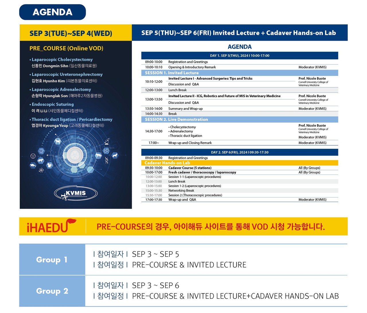 둘째날 9월 6일에는 IACUC 승인 받은 카데바를 이용한 흉·복강경 검사 핸즈온 랩 실습이 진행되며, Buote 교수와 KVMIS가 인스트럭터로 나선다.