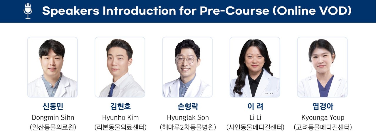 신동민(일산동물의료원) 센터장, 이려(샤인동물메디컬센터) 원장, 김현호(24시리본동물의료센터) 원장, 손형락(해마루이차동물병원) 외과부장, 엽경아(고려동물메디컬센터 인터벤션&MIS) 센터장 등 총 5명의 수의사가 강사 및 인스트럭터로 나서 △복강경 담낭절제술 △복강경 부신절제술 △유미흉 수술 △복강경 신장절제술 △복강경 봉합술 등 총 5개 주제로 온라인 강의를 진행할 예정이다.