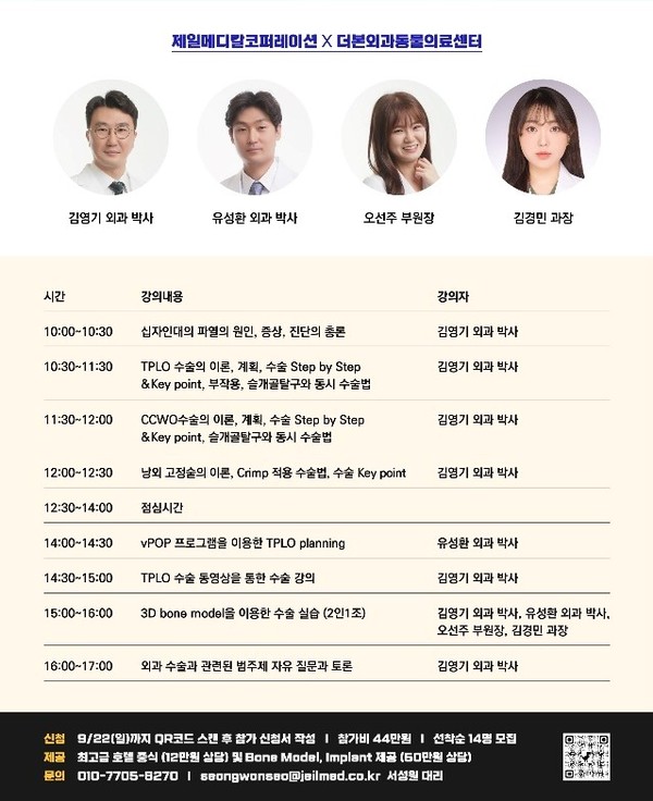 이번 코스는 부산 지역에서 외과 전문 동물병원으로 잘 알려진 더본외과동물병원의 김영기 외과박사를 비롯해 유성환 외과 박사, 오선주 부원장, 김경민 외과 과장이 연자로 참여할 예정이다.