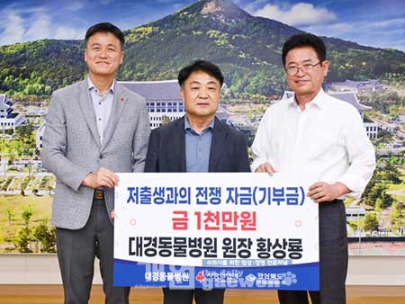 황상룡(경상북도수의사회) 수석 부회장이 이철우 경상북도지사에게 ‘저출생 극복 성금’ 1천만 원을 전달했다.