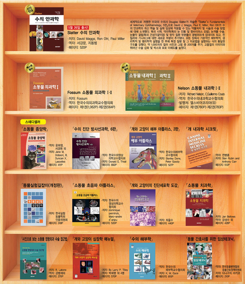 수의학 서적 전문 출판사 오케이벳(대표 이상돈)이 추천하는 임상수의사가 반드시 읽어야 하는 필독서 15선을 소개한다. 12권의 스테디셀러와 2권의 베스트셀러를 비롯해 오는 5월 26일 출간 예정인 『Slatter 수의 안과학, 5판』까지 한눈에 알아 볼 수 있도록 일목요연하게 정리함으로써 독자가 필요로 하는 책을 쉽게 선택해 찾아 볼 수 있도록 했다. 문의는 오케이벳(042-330-0039)으로 하면 된다. <편집자주>