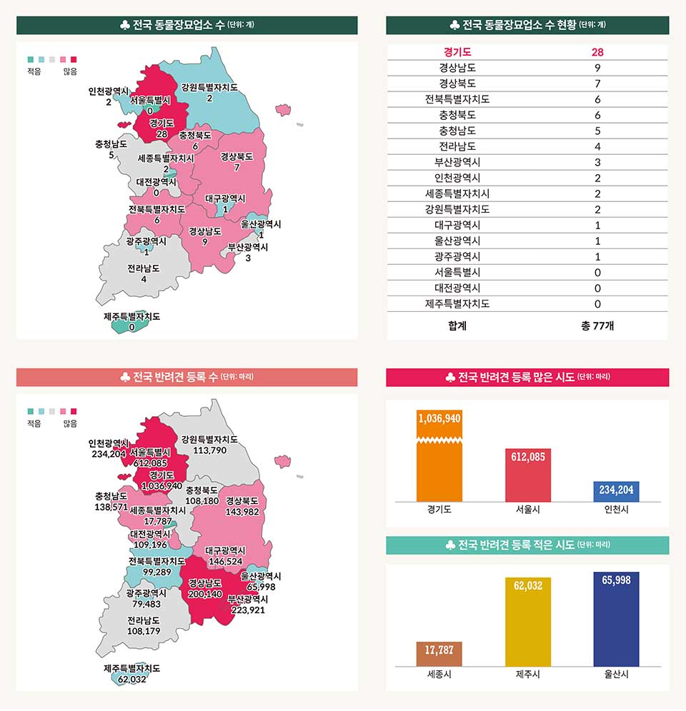 서울디지털재단이 농림축산식품부의 동물등록현황 데이터와 지방행정 인허가 데이터 개방 서비스 데이터를 활용해 반려동물 관련 업종 중 전국 시도별 동물장묘업소 현황을 분석한 결과, 2024년 3월 기준 전국에 영업 중인 동물장묘업소는 총 77개인 것으로 나타났다. 동물장묘업소란 반려동물 전용 장례식장이나 납골시설 및 동물화장시설 또는 동물건조장 시설을 설치해 운영하는 업소를 의미하는데, 서울을 비롯한 대전, 제주 등 총 3개 시도를 제외한 모든 시도에 하나 이상의 동물장묘업소가 존재했다. 그 중 경기도에 전체 36.4%에 달하는 28개가 위치하고, 다음으로 경상남도 9개, 경상북도 7개 순으로 분포했다. 한편 시도별 반려견 등록 수는 경기도가 1,036,940마리로 가장 많고, 서울이 612,085마리, 인천이 234,204마리로 그 뒤를 이었다. 반려견 등록 수가 가장 적은 시도는 세종이 17,787마리로 가장 적었으며, 제주와 울산이 각각 62,032마리, 65,998마리로 조사됐다. <편집자주>