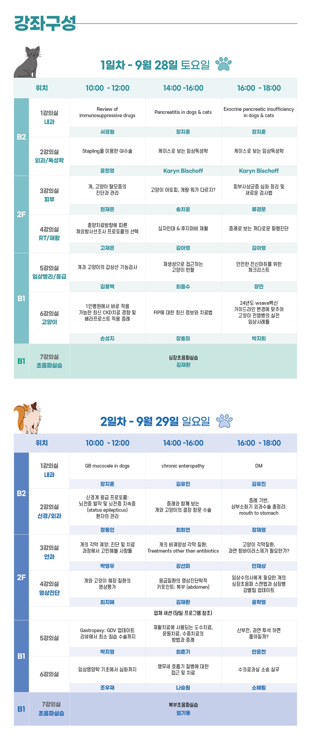 첫째 날인 28일(토)에는 1강의실에서 ‘내과’를 테마로 서경원(서울대) 교수가 ‘Review of immunosuppressive drugs’ 강의를 시작으로 장지훈 수의사가 ‘Pancratitis in dogs&cats’와 ‘Exocrine pancreatic insufficiency in dogs&cats’에 대해 강의한다. 2강의실에서는 ‘외과 및 독성학’을 테마로 윤헌영(건국대) 교수가 ‘Stapling을 이용한 GI 수술’을 설명하고, 캐린 비쇼프 교수가 ‘케이스로 보는 임상독성학’을 주제로 4시간 연속 강의를 펼칠 예정이다.