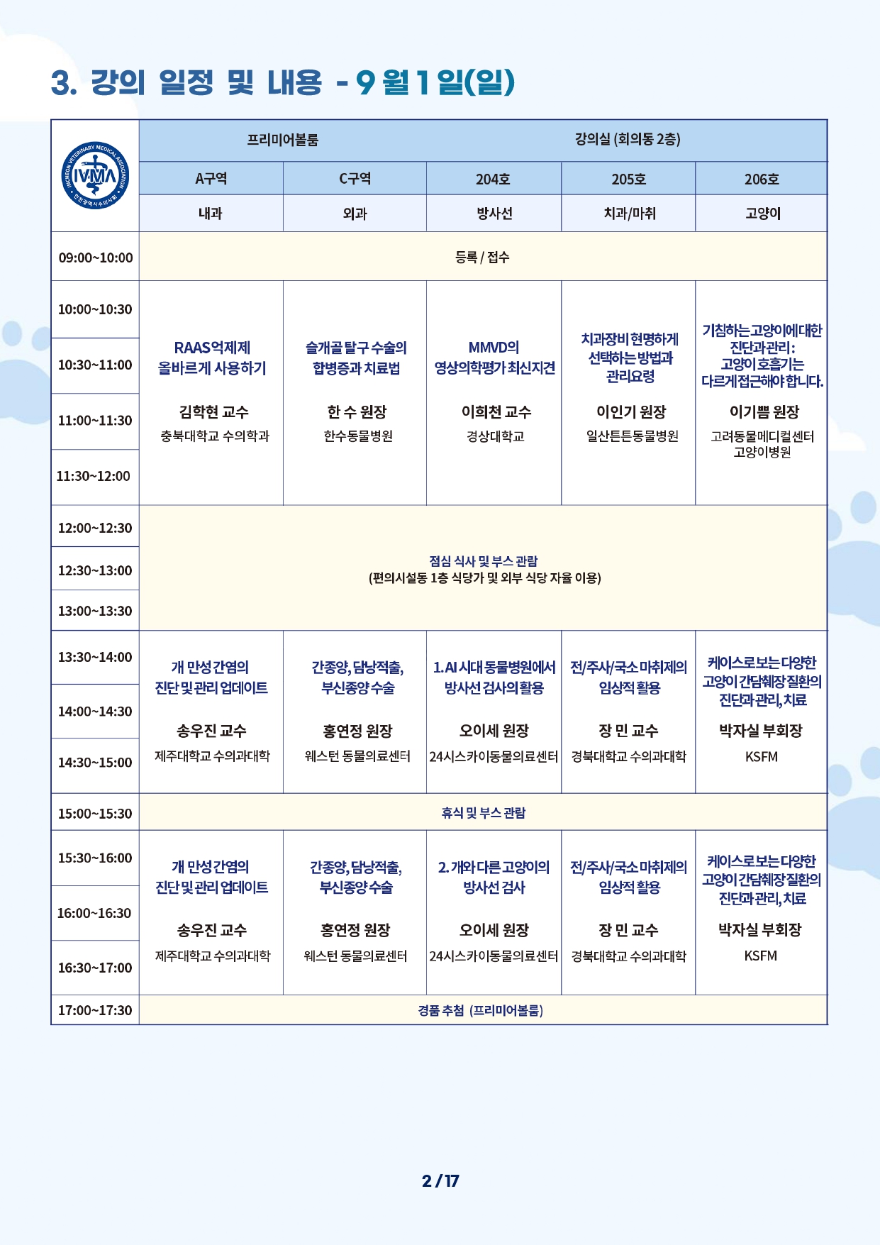 204호에서는 ‘방사선’ 테마로 이희천(경상대) 교수가 ‘MMVD의 영상의학평가 최신 지견’을 강의하고, 오이세(SKY동물메디컬센터) 원장이 ‘AI 시대 동물병원에서 방사선 검사의 활용’과 ‘개와 다른 고양이의 방사선 검사’를 강의할 예정이다.