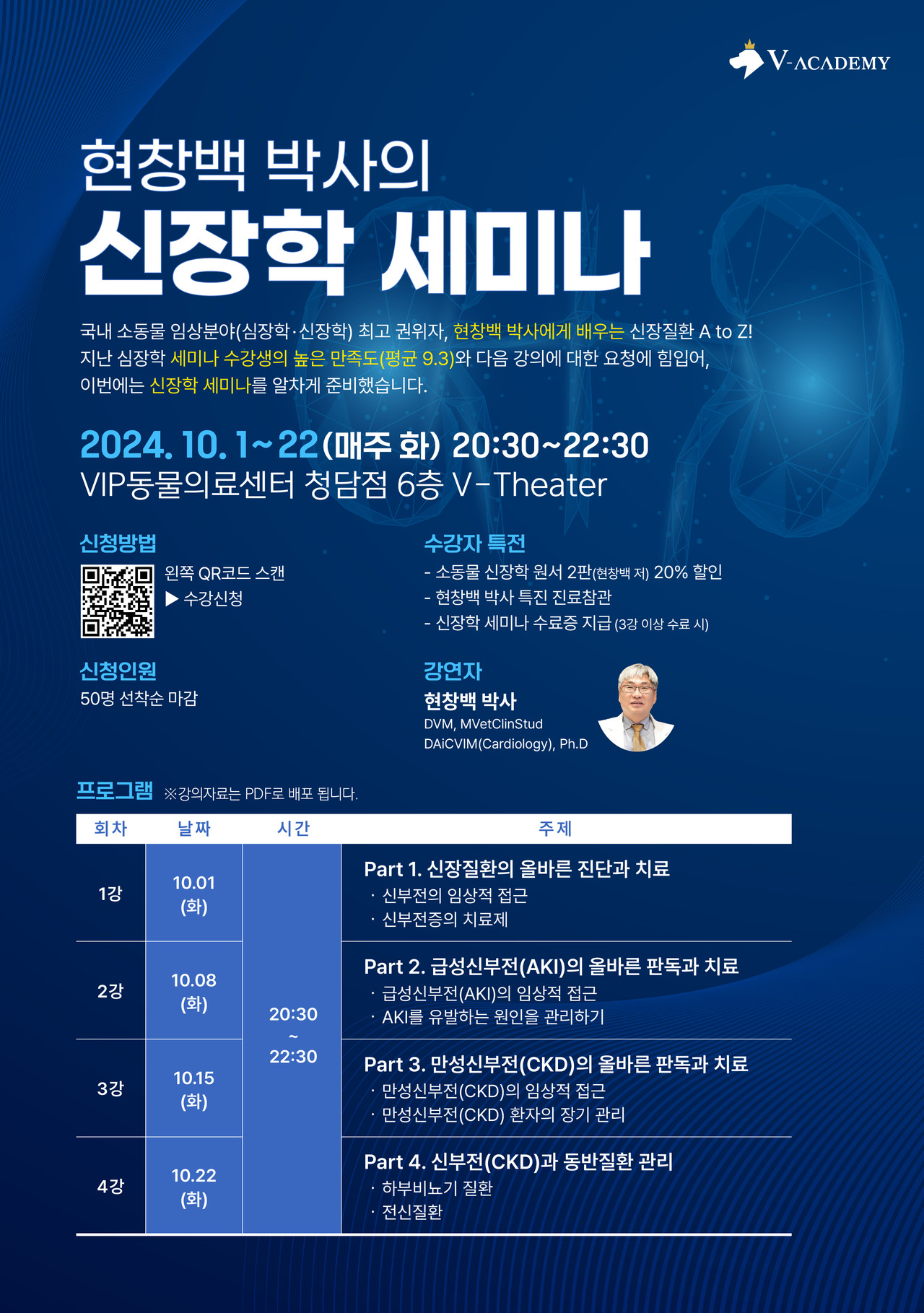 V-ACADEMY가 현창백 박사의 ‘소동물 신장학 세미나’를 오는 10월 1일(화)부터 22일(화)까지 매주 화요일 오후 8시 30분부터 10시 30분까지 VIP동물의료센터 청담점 V-Theater에서 개최한다.