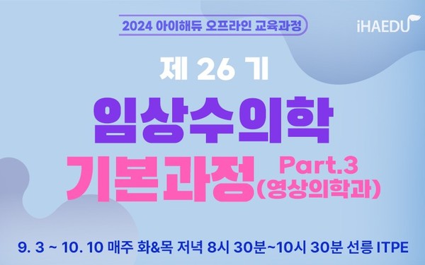 아이해듀가 진행하는 ‘제26기 임상수의학 기본과정 파트3(영상의학과)’ 신청이 9월 2일(월) 마감된다.