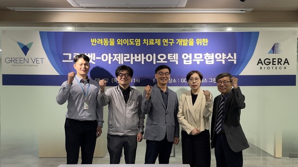 GC녹십자의 자회사이자 반려동물 토탈 헬스케이 기업 그린벳(대표 박순영)과 바이오기업 아제라바이오텍(대표 신순영)이 지난 8월 22일 경기도 용인시에 위치한 그린벳 본사에서 반려동물 외이도염 치료제 연구개발을 위해 업무 협약을 체결했다.