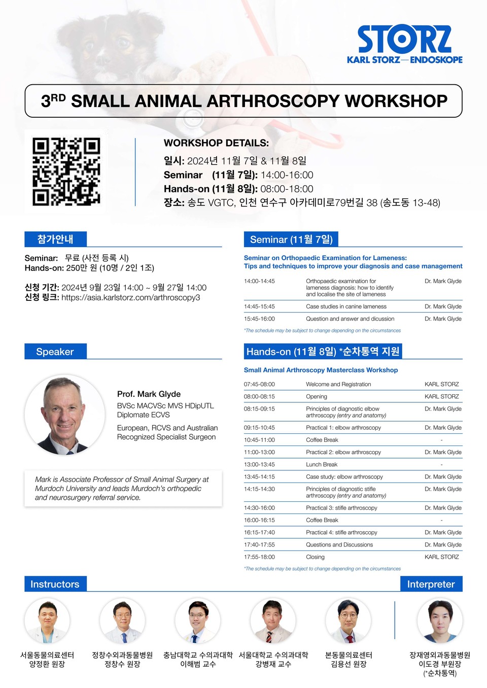 11월 8일 핸즈온 실습에는 Mark Glyde 교수를 비롯해 양정환(서울동물의료센터) 원장, 정창수(정창수외과동물병원) 원장, 이해범(충남대) 교수, 강병재(서울대) 교수, 김용선(본동물의료센터) 원장 등 총 5명이 Instructor로 참여할 예정이며, 이도경(장재영외과동물병원) 부원장이 통역으로 참여한다.