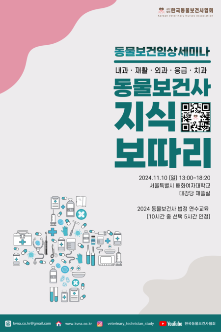 세미나는 동보협 홈페이지(http://www.kvna.co.kr/)에서 신청 가능하며, 참가 시 선택교육 5시간이 인정된다.