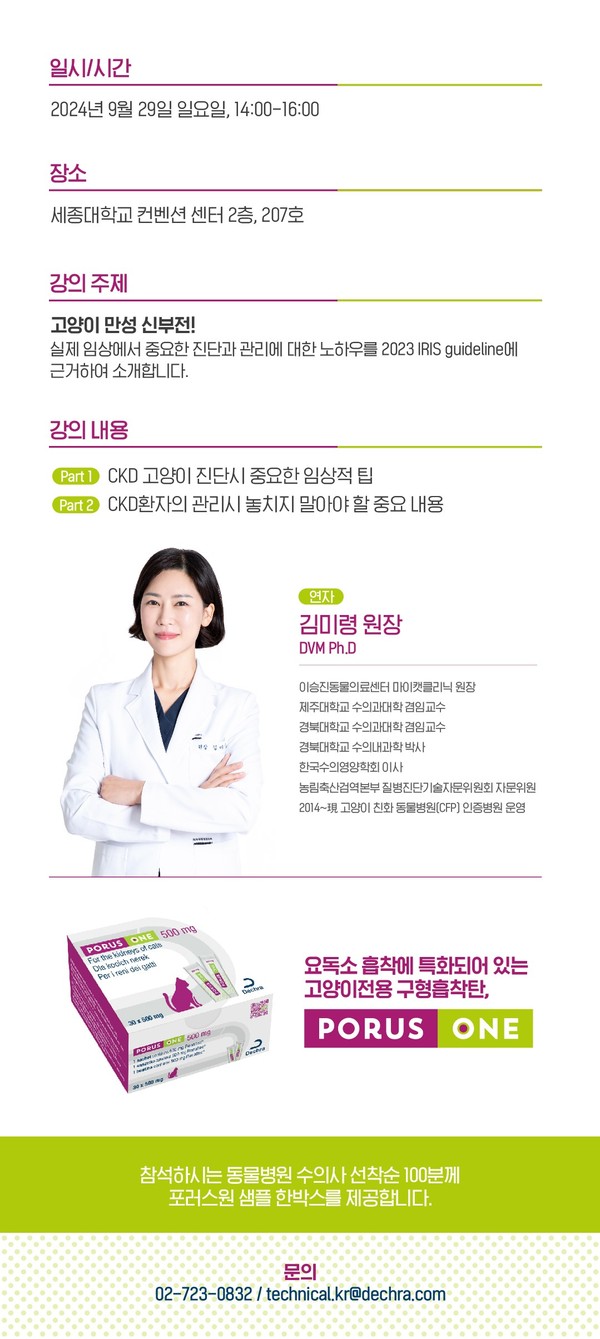 데크라 측은 “이번 세미나는 만성 신부전 고양이의 IRIS 가이드라인에 기반한 진단과 치료에 도움이 될 수 있을 것”이라며 많은 참여를 바랐다.