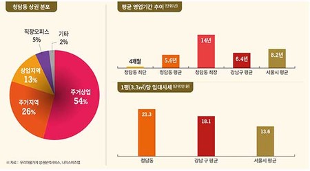 청담동은 주거상업 54%, 주거지역 26%, 상업지역 13%, 직장오피스 5%, 기타 2%로 구성된 주거와 상업이 공존하는 상권이다.