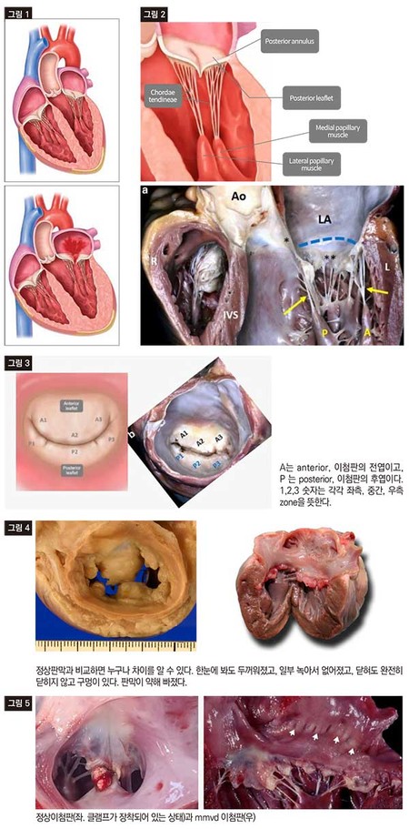 [그림 3] 정상 판막은 맨 오른쪽 사진처럼 얇고 탱탱하다. 안쪽으로 건삭이 심근과 연결된 것이 보인다. 그런데 mmvd와 dog을 구글링 해보면 아주 충격적인 사진들이 눈에 띈다.