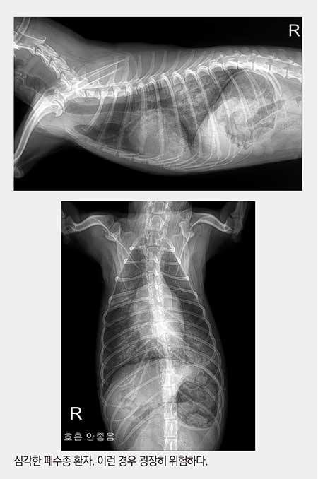 C의 다음 단계는 자꾸 폐수종으로 실려오는 상황이 생기는 D단계이다. 약 용량을 늘려도, 횟수를 늘려도, 약을 바꿔도, 자꾸자꾸 폐수종이 진행되면 우리는 D단계라고 생각하고, 보호자에게는 이제는 몇 주~2,3개월 정도 남았을 가능성이 크다고 이야기 한다.