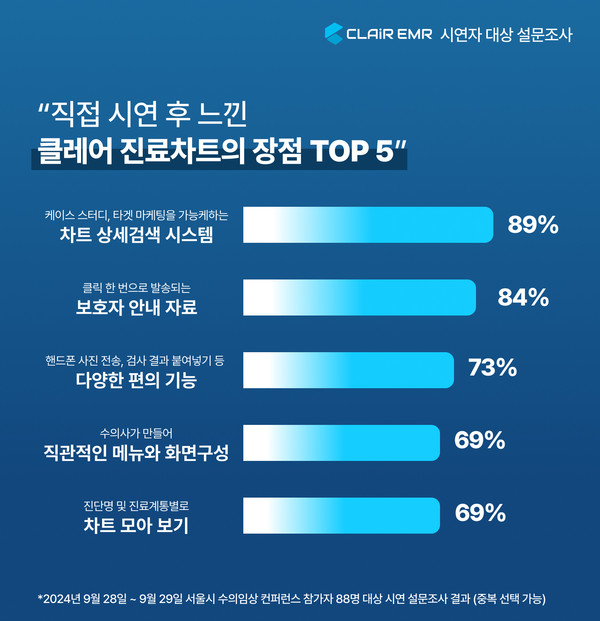 실제 시연자가 뽑은 ‘클레어 진료차트’ 장점 투표 결과에 따르면, ‘케이스 스터디와 타깃 마케팅을 가능케 하는 강력한 차트 검색 시스템’이 89%로 1위를, ‘클릭 한 번으로 발송되는 보호자 안내자료’가 84%로 2위를 차지했다.