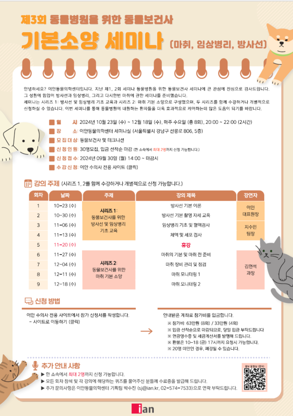 수강신청은 이안 수의사 전용사이트(https://forms.gle/uzStd4Frrs5Z3bX17)에서 진행할 수 있다. 추가 문의사항은 이안동물의학센터 이메일(sj@ian.kr) 또는 전화(02-574-7533)로 하면 된다.
