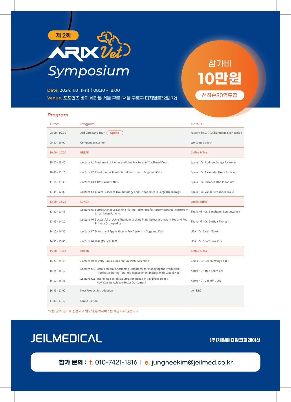 ㈜제일메디칼코퍼레이션(대표 박재일)이 ‘제2회 ARIX VET 심포지엄’을 오는 11월 1일(금) 포포인츠 바이 쉐라톤 서울 구로에서 개최한다.