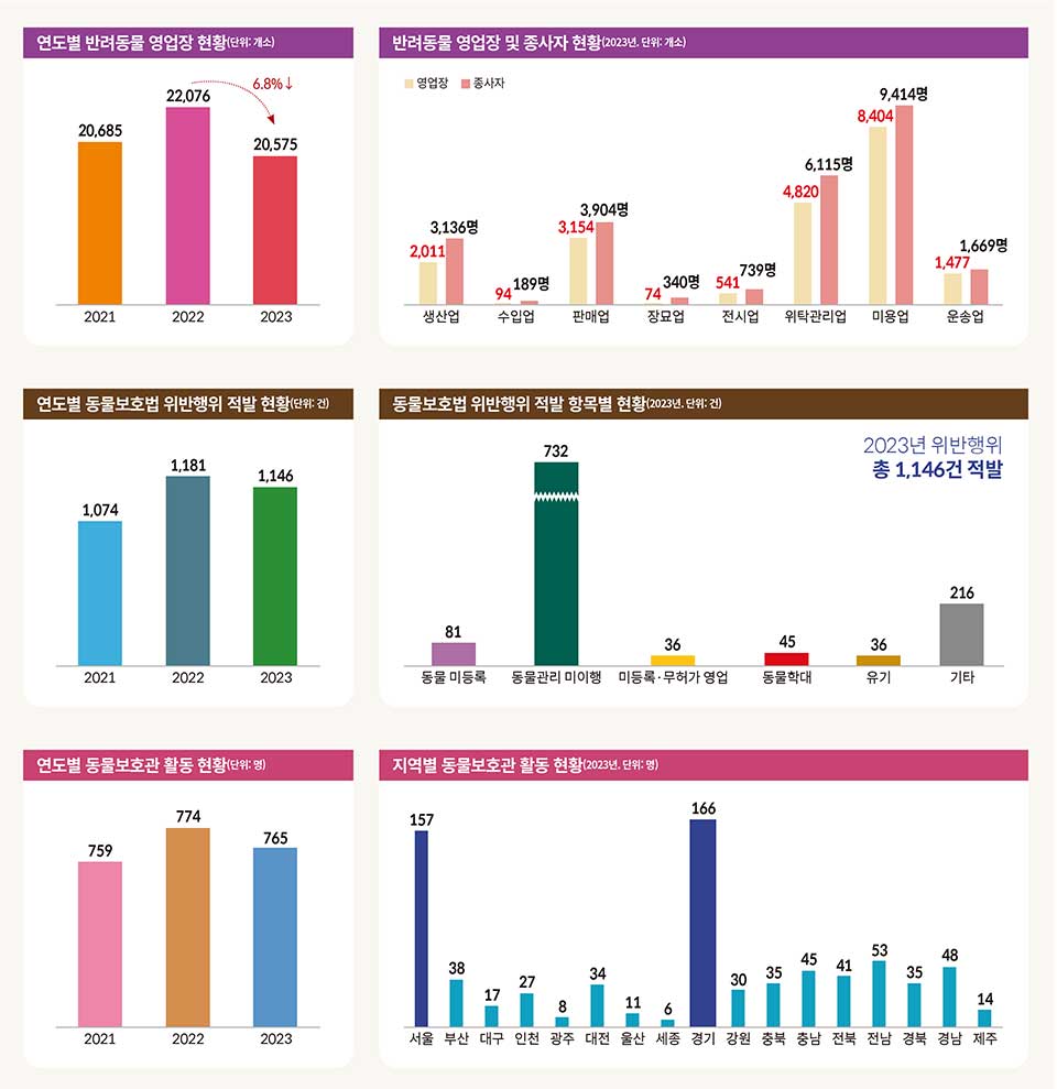 농림축산검역본부가 지난 7월 발표한 ‘2023년 반려동물 보호 및 복지 실태조사’ 결과에 따르면, 반려동물 관련 영업장은 총 8종으로 2022년 22,076개소보다 6.8% 감소한 20,575개소로 나타났다. △‘동물미용업’이 8,404개소(40.8%)로 가장 많았고 △‘위탁관리업’ 4,820개소(23.4%) △‘판매업’ 3,154개소(15.3%) △‘생산업’ 2,011개소(9.8%) △‘운송업’ 1,477개소(7.2%) △‘전시업’ 541개소(2.6%) △‘수입업’ 94개소(0.5%) △‘장묘업’ 74개소(0.4%) 순으로 허가 및 등록됐다. 그 중 ‘장묘업’과 ‘운송업’은 2022년 대비 각각 6개소, 164개소 증가하며 매년 증가 추세인 것으로 조사됐다. 또한 지자체는 동물 학대 대응 등 동물보호 업무를 위해 동물보호관 총 765명을 지정하고, 동물보호법 위반 행위 1,146건을 적발했다. 주요 위반사항으로는 ‘반려견과 외출할 때 목줄 착용, 인식표 부착 등에 대한 위반’이 732건(63.9%)으로 가장 많았고, ‘반려견 미등록’ 81건(7.1%), ‘동물학대’ 45건(3.9%), ‘미등록 및 무허가 영업’과 ‘유기’가 각각 36건(3.1%)으로 뒤를 이었다. <편집자주>