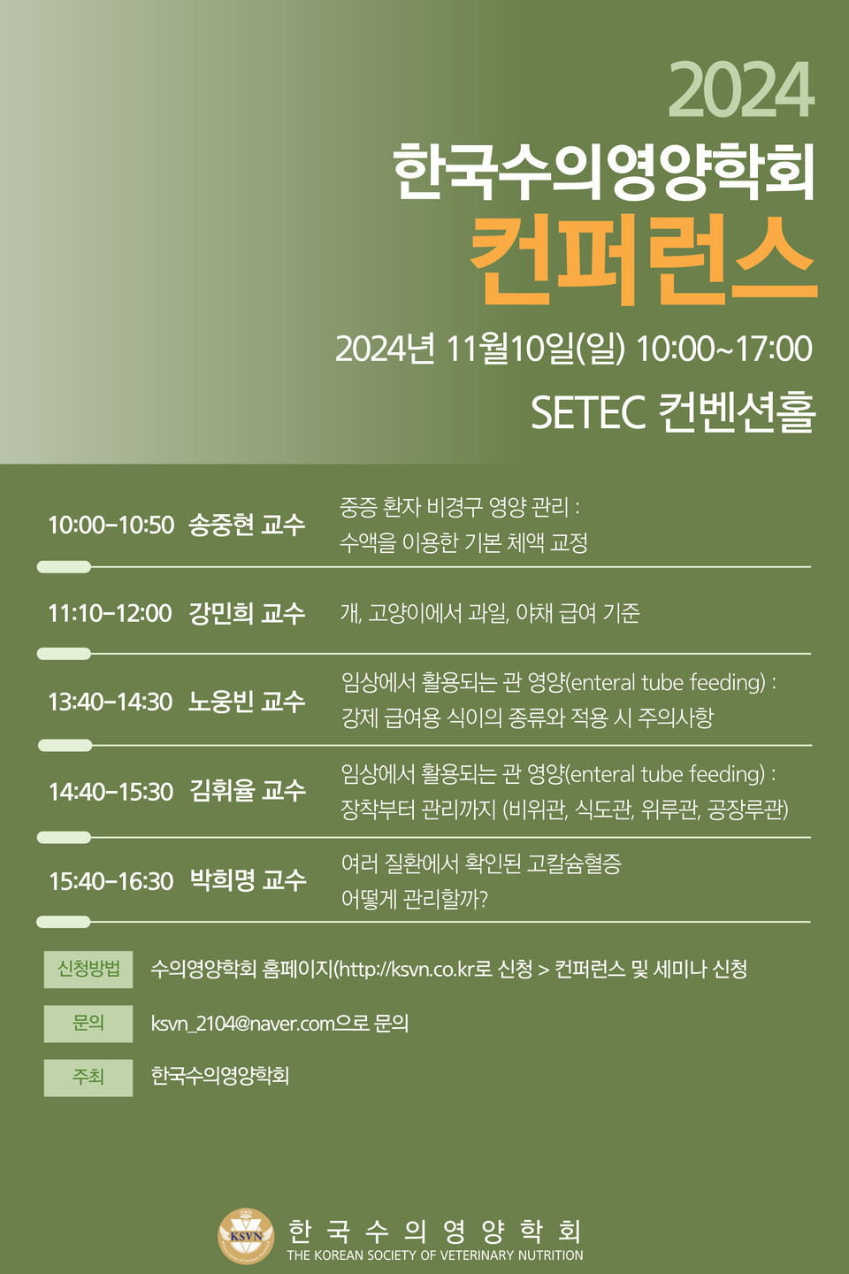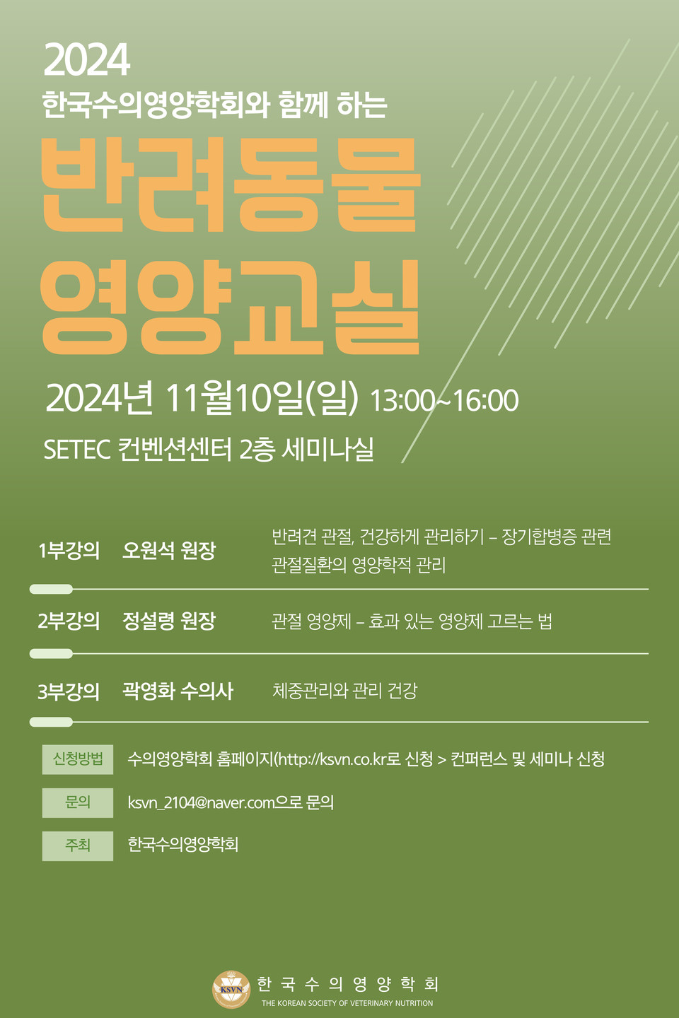 한국수의영양학회(회장 양철호, 이하 KSVN)가 ‘2024 한국수의영양학회 컨퍼런스’를 오는 11월 10일(일) 오전 10시부터 오후 5시까지 SETEC 컨벤션홀에서 개최한다.