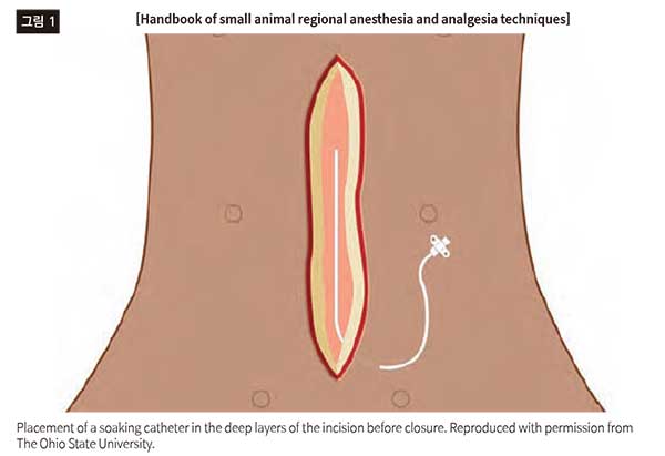 진행 방법은 멸균수술 과정 중 피부의 healing 과정을 방해하지 않게 수술 절개선의 dorsal 방향으로 약간 떨어진 곳에 작은 구멍을 낸 후 그 구멍을 통해서 wound soaker catheter를 삽입한다.