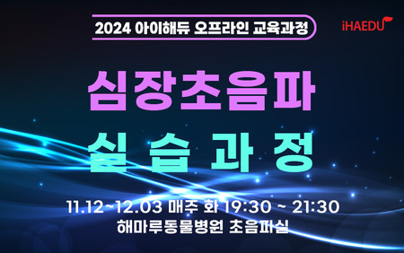 아이해듀 오프라인 교육과정 ‘심장초음파 실습과정’이 11월 12일부터 12월 3일까지 매주 화요일 총 4회 일정으로 저녁 7시 30분에 해마루동물병원에서 진행된다.