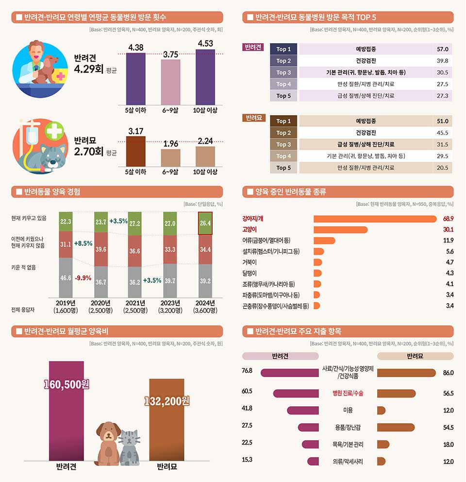 오픈서베이가 올해 8월 발표한 ‘반려동물 트렌드 리포트 2024’에 따르면, 반려동물 양육률은 2019년, 2020년 소폭 성장세를 보이다가 2021년 이후로 성장세가 둔화된 양상을 보이는 것으로 나타났다. 반려동물 양육자와 양육 중단자를 포함한 ‘양육 경험률’ 또한 2020년에 크게 증가한 뒤 이후로 큰 변화를 보이지 않았다. 현재 양육 중인 반려동물은 강아지가 약 68.9%로 압도적으로 많고, 고양이가 30.1%로 그 뒤를 따랐다. 반려동물 월평균 양육비는 반려견은 160,500원, 반려묘는 132,200원으로 나타났는데, 반려견은 미용, 반려묘는 사료 및 건강식품과 용품 및 장난감이 차지하는 비중이 가장 큰 것으로 조사됐다. 연평균 동물병원 방문 횟수는 반려견이 4.29회, 반려묘가 2.7회로 반려견은 나이가 5살 이하 또는 10살 이상일 때 많이 방문하고, 반려묘는 5살 이하일 때 특히 많이 방문하는 것으로 나타났다. 반려견과 반려묘 모두 ‘예방접종’ 목적으로 방문하는 비중이 가장 높았으며, ‘건강검진’이 그 뒤를 이었다. <편집자주>