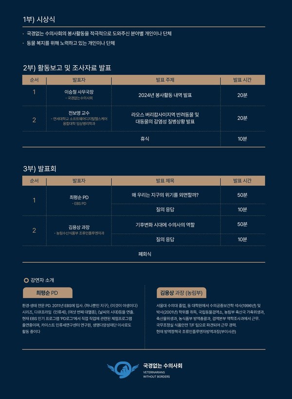 이어 2부에서는 이승철(국경없는 수의사회) 사무국장이 ‘2024 봉사활동 내역’을 보고하고, 전보영(연세대) 교수가 ‘라오스 버리캄사이지역 반려동물 및 대동물의 감염성 질병상황’에 대한 조사자료를 발표할 예정이다.