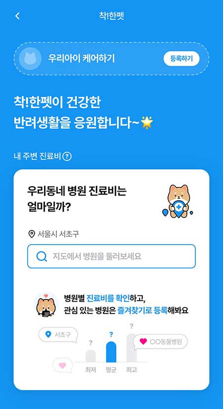 본지가 ‘삼성화재 다이렉트 착’ 애플리케이션을 통해 확인한 결과, ‘착!한펫’ 서비스를 통해 ‘우리 동네 병원 진료비는 얼마일까?’라는 메시지와 함께 동물병원 진료비 비교 서비스를 제공하는 것을 확인할 수 있었다.