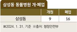 행정안전부 최신 데이터에 따르면, 강남구 삼성동은 1999년부터 동물병원이 개원하기 시작해 2024년 9월 31일 기준 총 25개소가 개원, 이 중 16개소(64%)가 문을 닫고, 현재 9개소(36%)가 개원을 유지하고 있다.