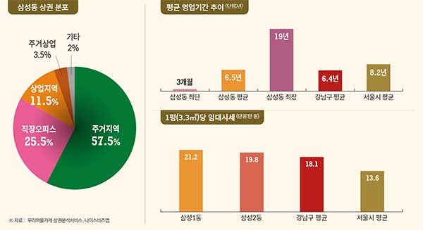 삼성1동의 1평(3.3㎡) 당 건물 평균 임대료는 21만 2천원 선이며, 1층 임대료는 15만 6천원이다. 삼성2동의 평균 임대료는 19만 8천원이며, 1층 임대료는 24만 8천원이다. 삼성1동, 2동 모두 강남구 평균인 18만 1천원을 상회하며 강남구 내 다른 지역과 비교해도 상당히 높은 편이다.