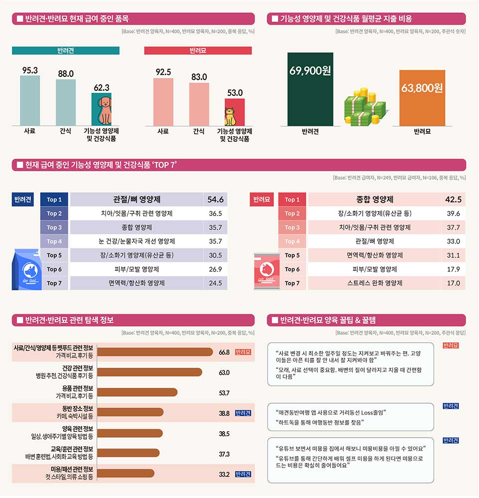 오픈서베이가 올해 8월 발표한 ‘반려동물 트렌드 리포트 2024’에 따르면, 대부분의 양육자가 반려동물에게 사료 및 간식을 급여하고 있었으며, 기능성 영양제와 건강식품 급여 비중이 절반 이상을 차지하는 것으로 나타났다. 기능성 영양제와 건강식품의 급여율은 반려견 양육자가 반려묘 양육자보다 높았으며, 월평균 지출 비용 역시 반려견이 69,900원, 반려묘가 63,800원으로 반려견 양육자가 반려묘 양육자 대비 높은 것으로 조사됐다. 현재 급여 중인 기능성 영양제와 건강식품 ‘TOP 7’에는 반려견의 경우 관절 및 뼈 영양제가, 반려묘는 종합 영양제가 1위를 차지했다. 반려동물 관련 정보 탐색은 반려견 양육자는 동반 가능 장소와 미용 및 패션 관련 정보를, 반려묘 양육자는 펫푸드 관련 정보를 더 많이 탐색하는 것으로 나타났다. 이와 관련해 꿀팁 및 꿀템으로 반려견 양육자는 전문 앱으로 동반 여행 정보를 찾을 수 있는 점, 유튜브를 활용해 셀프 미용으로 미용비를 절약할 수 있는 점을 언급했으며, 반려묘 양육자는 사료 선택 관련 언급이 많았다. <편집자주> ※조사기간: 2024년 7월 25일~30일(총 6일간) / 조사대상: 전국 20~50대 남녀 3,600명