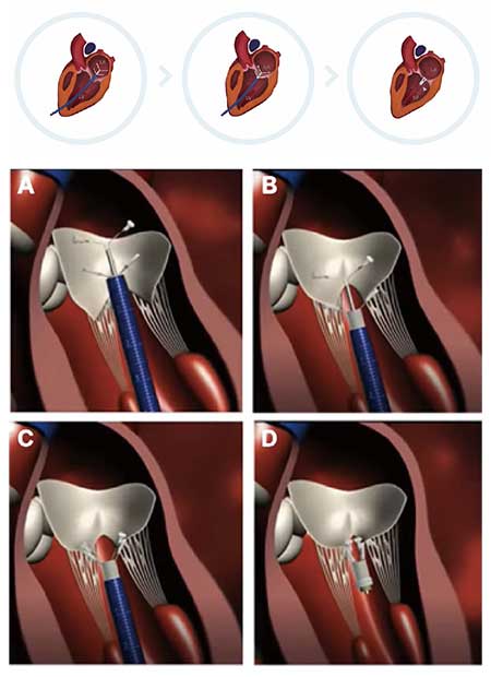 강아지의 TEER(브이클램프) 수술은 이런 것이다. 뛰고 있는 심장의 심첨에 카테터를 넣어서 클램프를 진입시키고, 그 클램프로 이첨판의 앞쪽판막과 뒤쪽판막을 잡아서 고정한 후 디바이스를 분리한다.