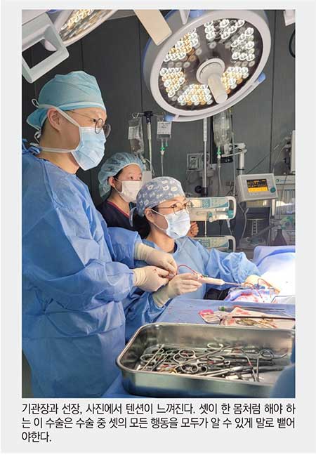 중요한 것은 이 수술의 술자가 ‘집도의’와 ‘보조술자’ 로 나누어져 있는 것이 아니란 것이다. 이 수술에서 필자가 맡은 역할은 ‘선장’이고, 필자와 함께 수술하는 외과의가 맡은 역할은 ‘기관장’이다. 그리고 무엇보다도 우리의 눈이 되어주는 TEE를 다루며 우리에게 술야를 보여주는 초음파 수의사는 ‘네비게이터’이다. 이렇게 셋이서 다리가 세 개인 의자처럼 수술한다. 한 명 이라도 본인의 역할을 잘 못하면 수술이 실패하게 된다.