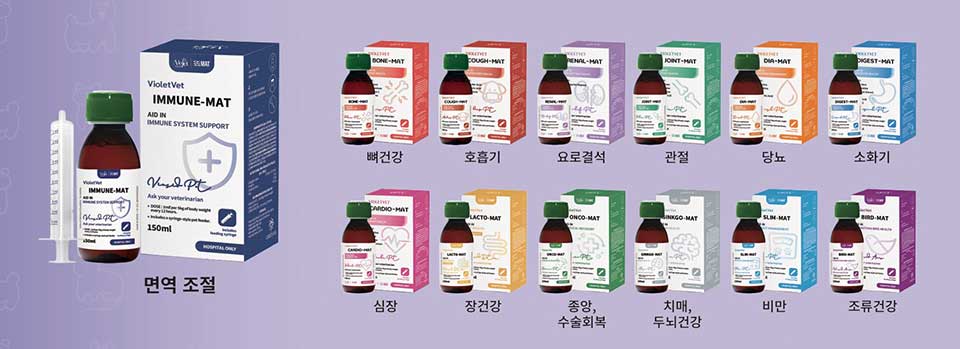 주요 제품군으로는 △요로결석 치료 보조제 ‘레날멧(Renal-MAT)’ △종양 치료 보조제 ‘온코멧(Onco-MAT)’ △관절 치료 보조제 ‘조인트멧(Joint-MAT)’ △당뇨 치료 보조제 ‘다이아멧(Dia-MAT)’ △치매, 두뇌관리 보조제 ‘징코멧(Ginkgo-MAT)’ 등 기존 11종을 새롭게 정비하고, 추가로 △장건강 보조제 ‘락토멧(Lacto-MAT)’ △조류용 면역보조제 ‘버드멧(Bird-MAT)’ Δ양축용 영양보조제 비우시드 아피스(Viusid-Apis)를 추가해 총 14종의 제품을 ‘바이올렛 벳(Violet VET)’이라는 브랜드로 국내에 선보이게 됐다.