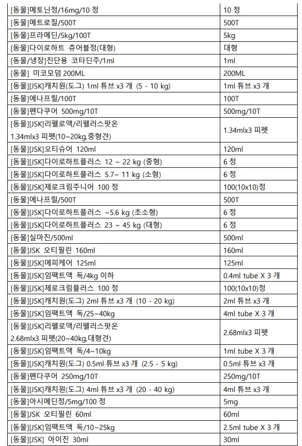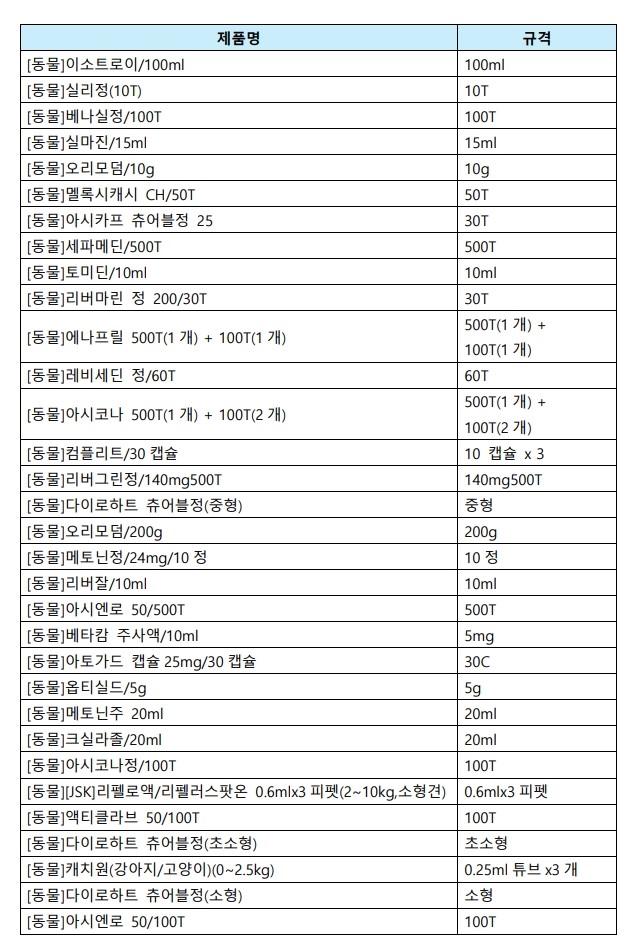 △이소트로이 △실리정 △베나실정 △실마진 △오리모덤 △멜록시캐시 △아시카프 츄어블정 △세파메딘 △토미딘 △리버마린 정 △에나프릴 △레비세딘 정 △아시코나 △아시코나정 △컴플리트 △리버그린정 △다이로하트 츄어블정 △다이로하트플러스 △메토닌정 △리버잘 △아시엔로 △베타캄 주사액 △아토가드 캡슐 △옵티실드 △메토닌주 △크실라졸 △리펠로액/리펠러스팟온 △액티클라브 △캐치원(강아지/고양이) △아시엔로 △메트로질 △프라메딘 △진단용 코타딘주 △미코모덤 △펜다쿠어 △오티슈어 △제로크림주니어 △제로크림플러스 △JSK 오티필린 △에피케어 △임팩트액 독 △아시메딘정 △아이진 △로티백 △베타캄 현탁액