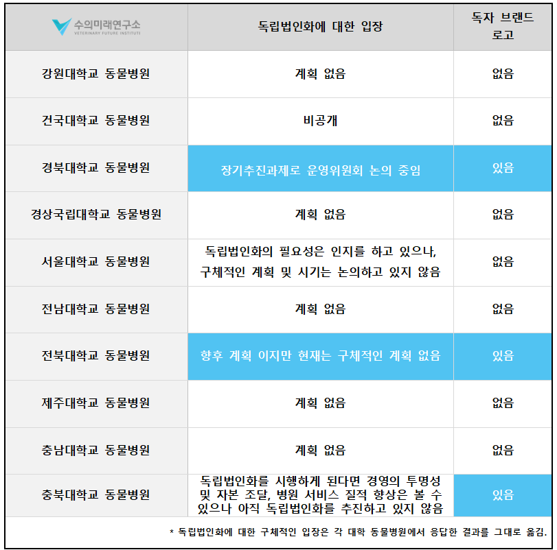 수의미래연구소(이하 수미연)가 전국 대학동물병원의 독립법인화에 대한 입장과 브랜드 로고 사용 유무 조사 결과를 발표했다.