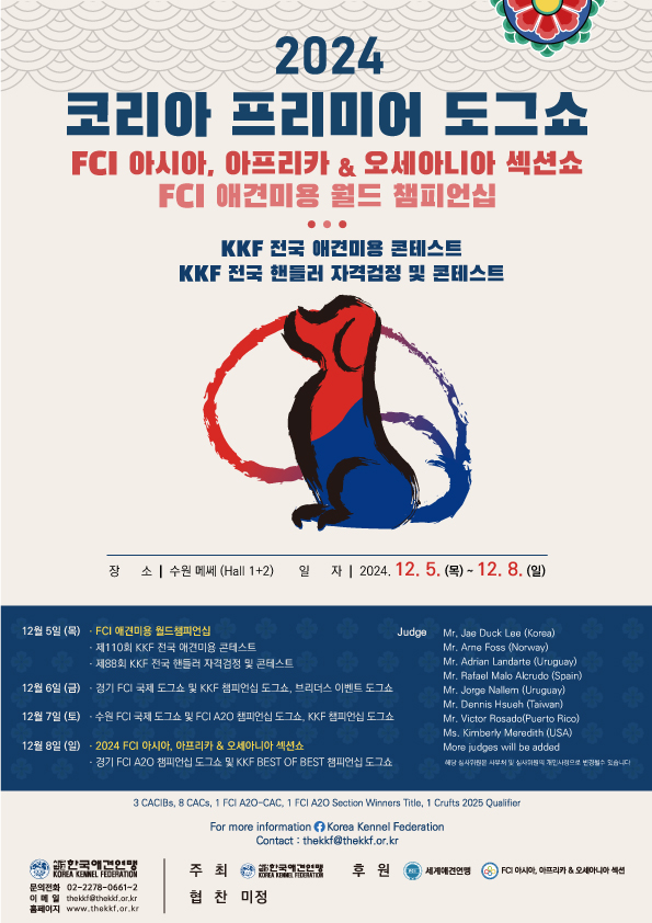 한국애견연맹(총재 송하경)이 오는 12월 5일(목)부터 8일(일)까지 수원 메쎄(Messe)에서 ‘2024 코리아 프리미어 도그쇼’와 ‘2024 FCI 아시아, 아프리카&오세아니아 섹션쇼’를 개최한다.