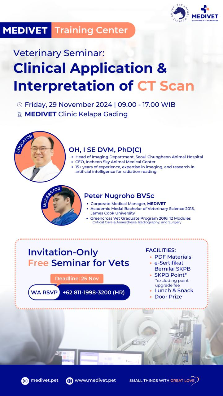 인도네시아의 MEDIVET Pet Hospital&Clinic Network(대표 Kristanya Oen)가 ‘Clinical Application&Interpretation of CT Scan’ 세미나를 오는 11월 29일(금) 오전 9시부터 오후 5시까지 MEDIVET Clinic Kelapa Gading에서 개최한다.