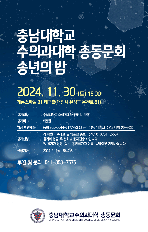 충남대학교 수의과대학 18대 총동문회(회장 이기영)가 오는 11월 30일(토) 오후 6시부터 대전시 계룡스파텔 지하 1층 태극홀에서 ‘2024 송년의 밤’을 진행한다.