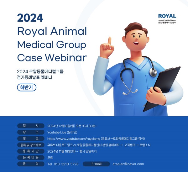 로얄동물메디컬센터가 ‘2024년 하반기 정기증례발표 웨비나’를 오는 12월 8일(일) 오전 10시30분부터 로얄동물메디컬그룹 유튜브(youtube.com/@ROYALAMG)에서 진행한다.