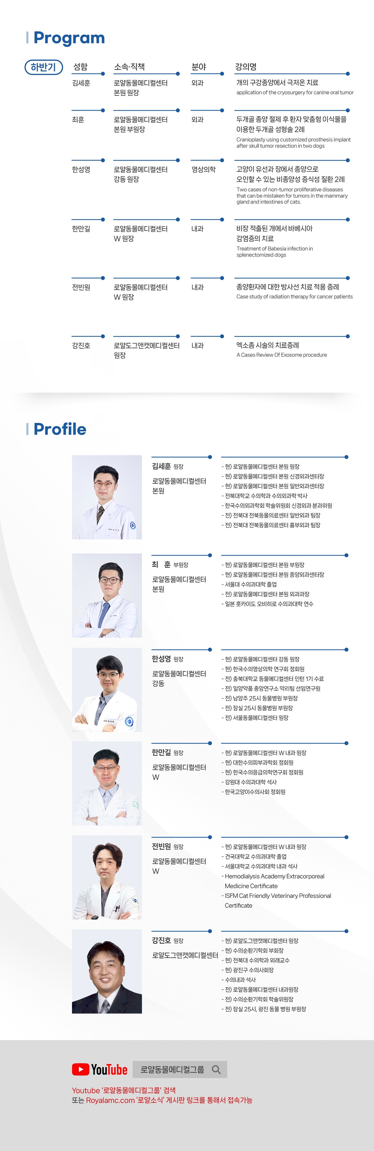 이번 하반기 증례발표회에는 로얄동물메디컬센터 본원의 김세훈 원장, 최훈 부원장과 로얄동물메디컬센터 강동의 한성영 원장, 로얄동물메디컬센터W의 한만길, 전빈원 원장, 로얄도그앤캣메디컬센터의 강진호 원장이 연자로 나선다.
