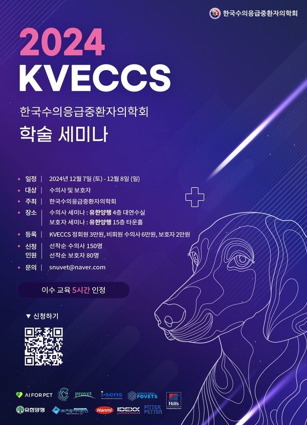 한국수의응급중환자의학회(이하 KVECCS)가 오는 12월 7일(토)~8일(일) 유한양행에서 ‘2024 KVECCS 학술 세미나’를 진행한다. KVECCS는 이번에 처음으로 수의사와 보호자 세미나로 나눠 이틀간 세미나를 진행할 예정이다.