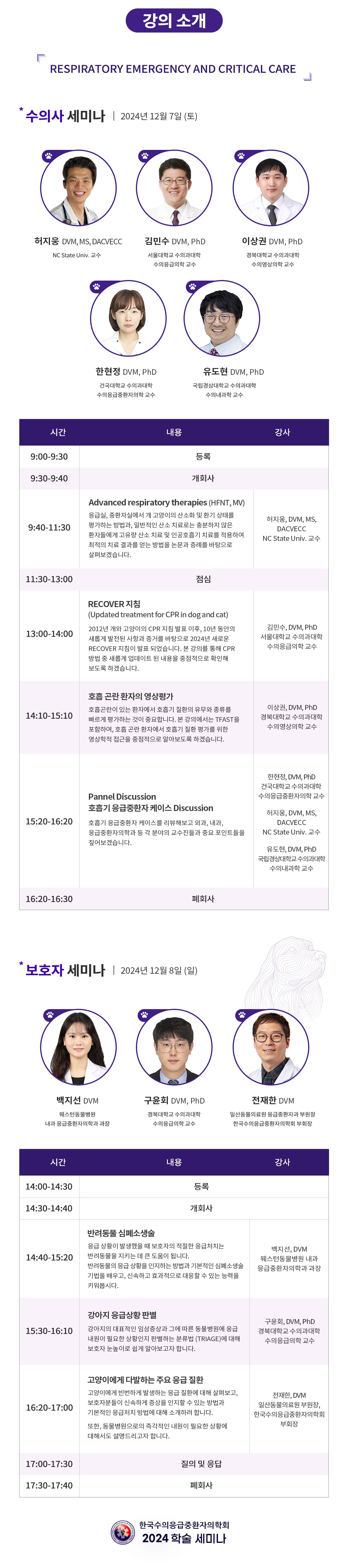 수의사 세미나는 첫날인 12월 7일 ‘호흡기 응급 및 응급 치료’를 주제로 오전 9시부터 오후 4시 30분까지 진행한다.