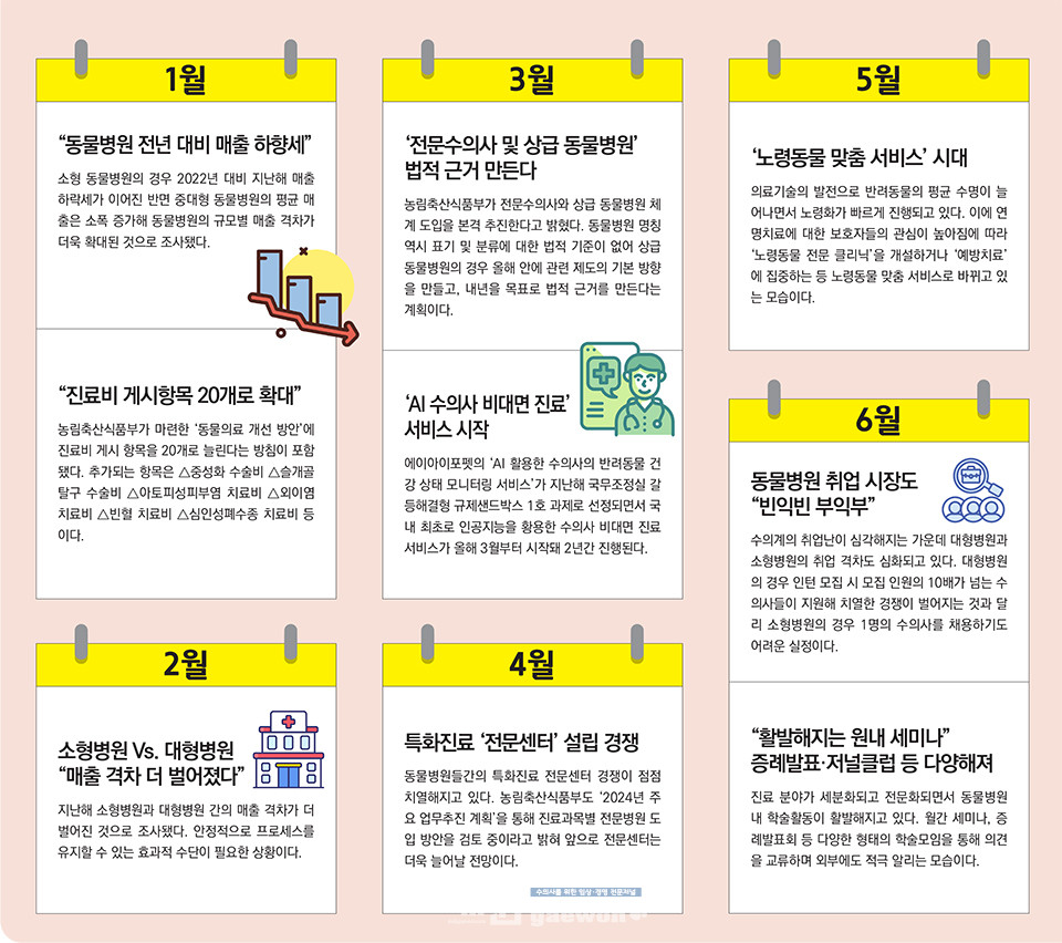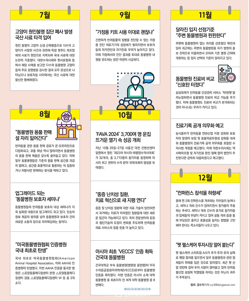 2024년 한 해 동안 본지가 보도한 기사 중 독자들의 높은 관심을 받은 월별 수의계 ‘Hot Issue’를 선정했다. 연초부터 동물병원 매출 하락 소식과 함께 소형병원과 대형병원 간 규모별 매출 격차가 더욱 벌어졌으며, 동물병원 간 경쟁이 심화되면서 ‘특화센터’, ‘노령동물’, ‘중증 난치성 질환’ 등 전문성을 강화하는 동물병원들이 많아졌다. 수의계를 향한 정부의 관심도 높았다. 농식품부가 진료비 게시 항목을 20개로 확대하고, 전문수의사 체계를 잡겠다고 밝혔으며, 진료기록 공개 의무화를 예고하기도 했다. 각종 논란도 이어졌다. 원인 불명의 고양이 신경·근육병증으로 국내 사료 업계가 곤욕을 치르기도 했다. 무엇보다 성공적인 ‘FAVA 2024’ 국내 개최를 비롯해 국내 최초 AAHA 인증병원 탄생, 아시아 최초 ‘VECCS’ 인증 획득 등 수의사 위상 만큼은 그 어느 때보다 높아진 한 해였다. <편집자주>