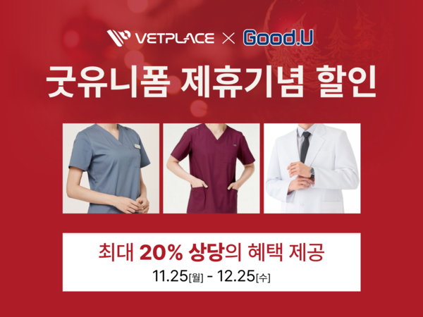 수의사 전용 커뮤니티 플랫폼 벳플레이스(대표 유석환)가 병원 유니폼 전문 브랜드 굿유니폼과 제휴를 기념해 오는 12월 25일(수)까지 특별 할인 이벤트를 진행한다.