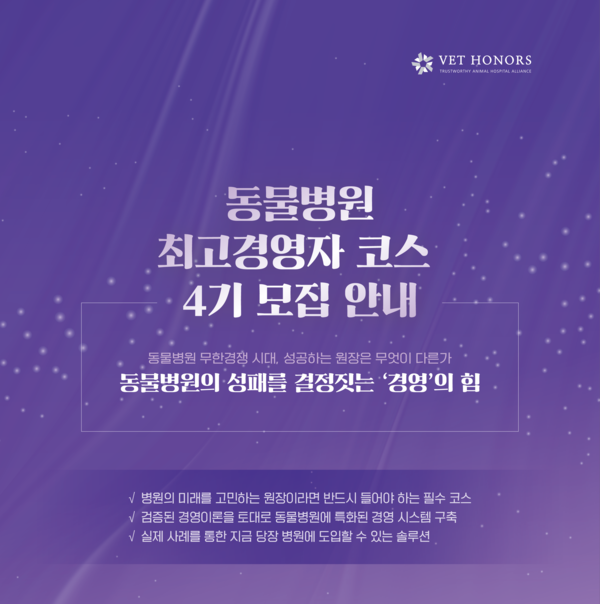 ㈜아이엠디티(대표 서상혁)가 운용하는 동물병원 얼라이언스 벳아너스가 ‘동물병원 최고경영자 코스 4기’를 선착순 모집한다.