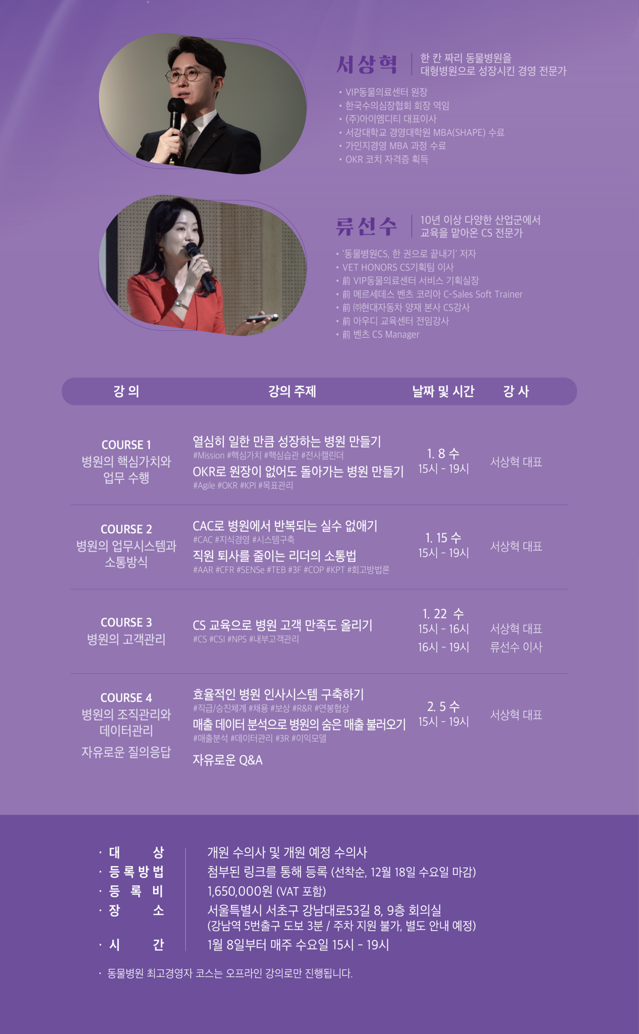 연자인 서상혁 대표는 아이엠디티 대표이자 VIP동물의료센터 원장으로 학술 및 경영지원 분야의 동물병원 경영 전문가로서 다양한 실전 경영 강의로 주목받고 있으며, 류선수 이사는 아우디, 현대자동차 등 다양한 산업군에서 10년 이상의 교육 경력을 가진 CS 전문가로 현재 벳아너스 CS기획팀 이사직을 맡고 있다.