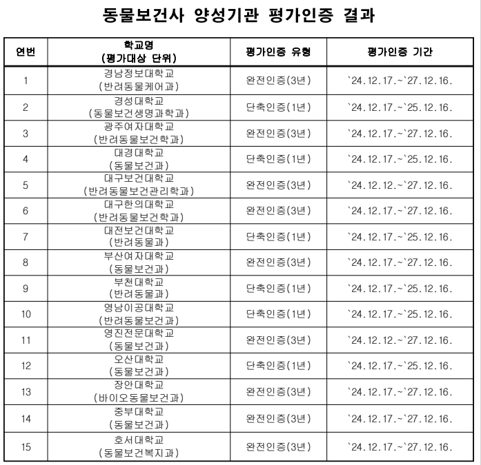 농림축산식품부(이하 농식품부)가 지난 12월 17일 동물보건사 양성기관 평가인증 결과를 발표했다. 이번 양성기관 평가인증 결과 총 15개 대학교가 평가인증을 통과했으며, 그중 9개 학교가 완전인증(3년)을 받았다.