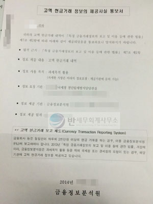 우리나라의 은행(금융기관)은 기본적으로 고액현금(2,000만원 이상)의 거래가 있는 경우 자동으로 금융정보분석원에 보고가 된다.